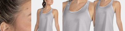 4.4 oz./yd²., 88/12 polyester/elastane wicking knit with Coolcore technology 92/8 polyester knitted mesh/elastane wicking knit inserts with Coolcore technology Four-way stretch Scoop neckline and racerback styling Dropped tail hem and side vents Tag-free label